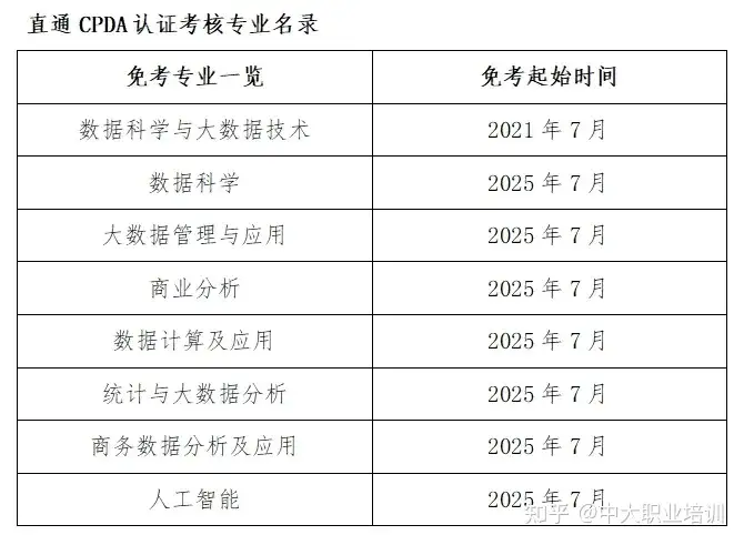 2025年9月,CPDA数据分析师增加免培即考的学员范围,除之前的“数据科学与大数据技术”专业外,新增数据科学、大数据管理与应用、商业分析、数据计算及应用、统计与大数据分析、商务数据分析及应用、人工智能等相关专业,以上专业均支持免培直接报名参加考核。