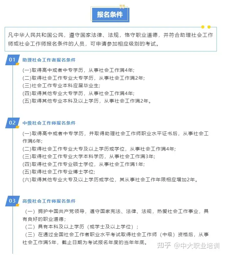 报考社工证需要满足一定的学历和工作经验要求。具体要求如下:助理社会工作师需要高中或中专学历加4年工作经验,或社会工作专业大专及以上学历加2年工作经验;中级社会工作师则需要更高的学历和更丰富的工作经验。请务必仔细阅读相关文件,确保自己符合报考条件。