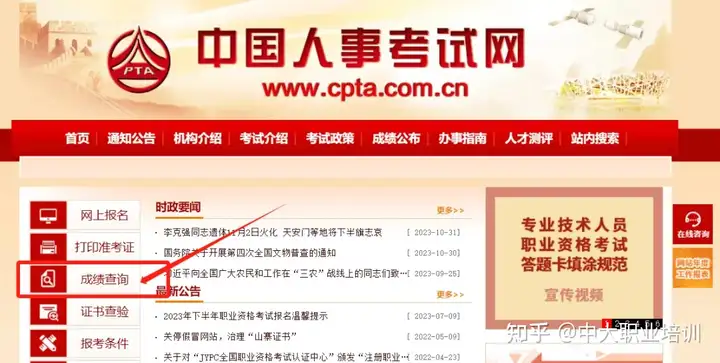①首先进入中国人事考试网,,然后进入左侧“成绩查询”。