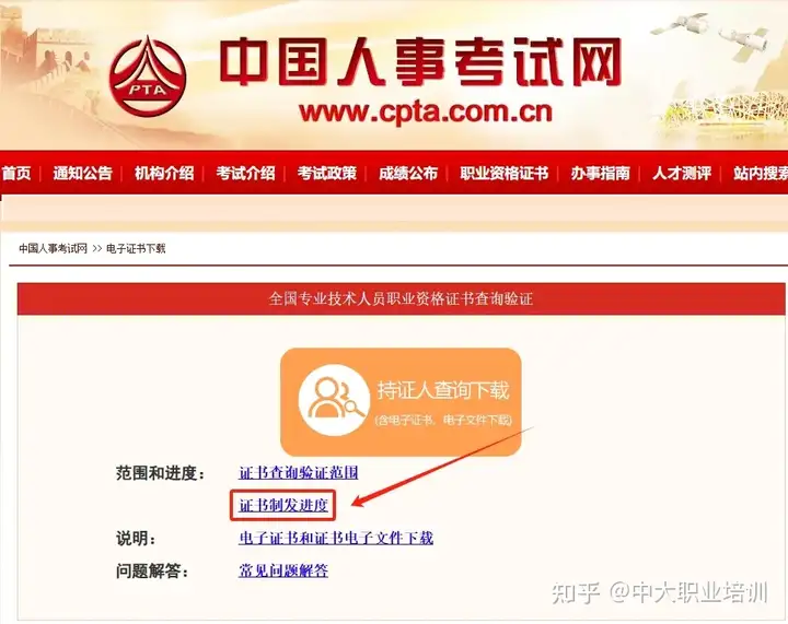 在此期间,大家可以关注中国人事考试网“资格证书”栏目,点击“电子证书下载”-“证书办理进度”查看证书的制作进度。