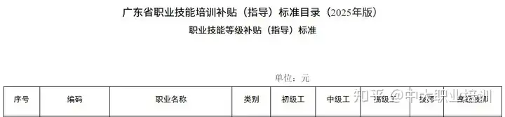 为进一步增强补贴性职业技能培训的产业发展导向和培训质效,更好地促进劳动者强技能稳就业,广东省人力资源和社会保障厅印发《广东省职业技能培训补贴(指导)标准目录(2025年版)》,人工智能训练师作为数字职业,补贴标准为五级(初级)1000元、四级(中级)1500元、三级(高级)2400元、二级(技师)3000元、一级(高级技师)3600元。