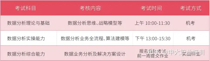 《数据分析理论知识》考试时间90分钟、《数据分析算法与模型》考试时间120分钟,安排在上午考试;《数据分析应用》考试时间120分钟,安排在下午考试。