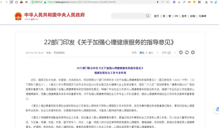 2016年,国家卫健委联合22部委发布《关于加强心理健康服务的指导意见》,是我国首个加强心理健康服务的宏观政策指导性文件。