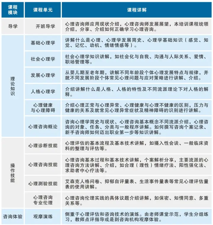 项目课程设计参考了《国家心理咨询师职业标准》,培训内容在原心理咨询师考证的基础上,根据实际需要,进行了重新创编,注重理论知识、技能训练、个案分析、情景模拟相结合,更加科学、实用、易学,具有很强的可操作性。