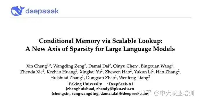 该论文为北京大学与DeepSeek共同完成,合著作者署名中出现梁文锋。论文提出条件记忆(conditional memory),通过引入可扩展的查找记忆结构,在等参数、等算力条件下显著提升模型在知识调用、推理、代码、数学等任务上的表现。同时,DeepSeek开源相关记忆模块Engram。