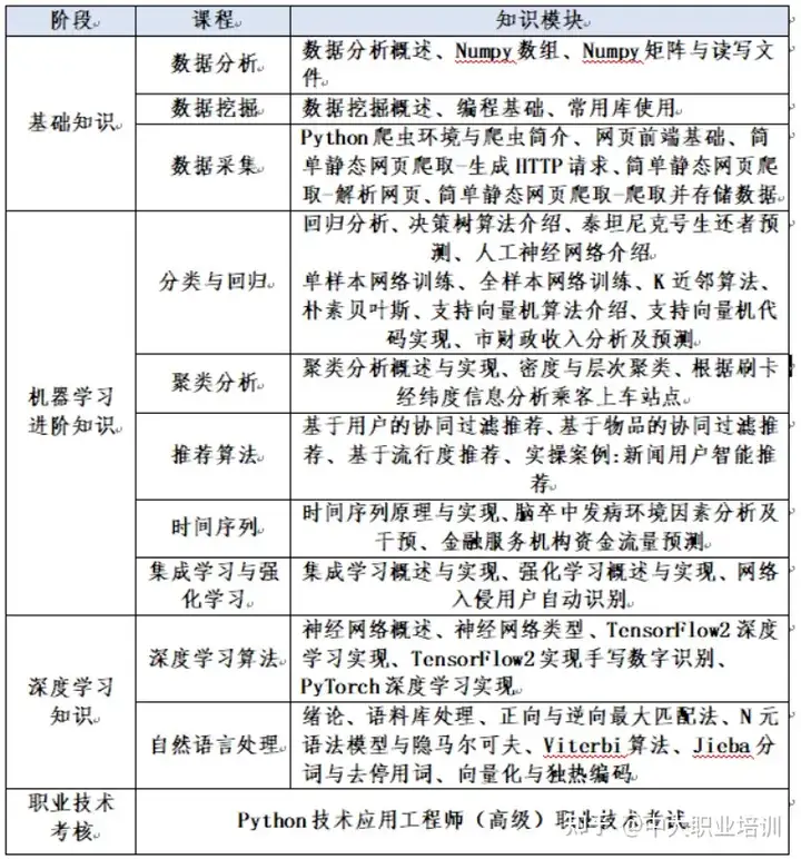 高级:认证构建了从数据处理到前沿算法的完整体系,覆盖数据采集、分析挖掘基础,系统讲授分类、回归、聚类、推荐与时间序列等机器学习算法及实战案例,并深入神经网络、TensorFlow与PyTorch框架及自然语言处理关键技术。最终通过入侵检测、金融预测等高级项目,考核候选人融合运用多种技术设计端到端智能解决方案的能力,认证其具备高级算法工程师或数据科学家水平。