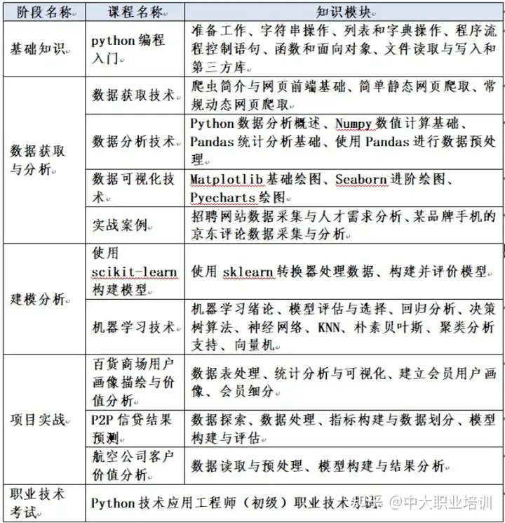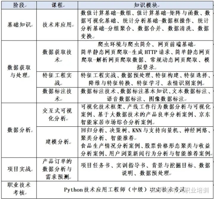 初级:认证始于Python与爬虫技术,随后系统讲授Numpy、Pandas、Matplotlib等数据分析工具。课程引入机器学习算法及sklearn实现,通过用户画像、信贷预测等实战项目,串联数据采集、处理、分析与建模全流程,验证学习者具备初级数据工程师解决实际商业问题的技术能力。