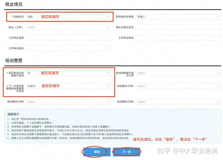 4️⃣ 登录后按照要求如实填写【基本信息、就业情况、培训意愿】等相关个人信息,所有带*号的内容都必须填写。填写完成后,点击保存并点击下一步。