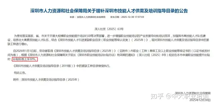深圳市人力资源和社会保障局发布《深圳市人力资源和社会保障局关于增补深圳市技能人才供需及培训指导目录的公告》,规定自2026年1月1日起,劳动者在本市申请职业技能提升补贴时,补贴标准上浮30%,三级人工智能训练师在深圳可申请3120元补贴。