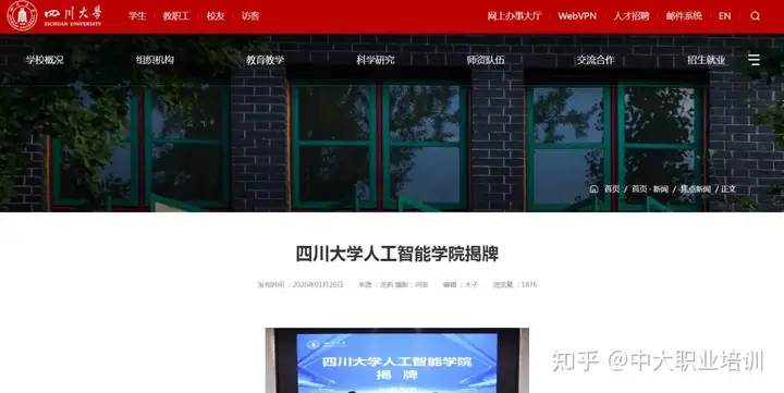 1月26日,四川大学人工智能学院正式揭牌。该学院将围绕智能科学与技术学科内涵,系统布局人工智能前沿探索与人工智能融合两大主攻方向,培养一流人才、汇聚顶尖师资、加强科研创新、深化校企合作、服务国家社会,努力建设一流的人工智能学院和学科。