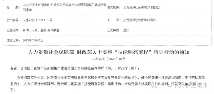 2025年3月,人社部、财政部发布《关于实施“技能照亮前程”培训行动的通知》(人社部发〔2025〕10号),要求围绕重点群体和重点领域,推行“岗位需求+技能培训+技能评价+就业服务”四位一体项目化培训模式。