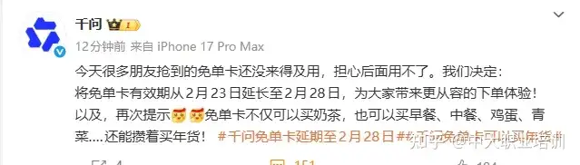 千问官方账号发文表示免单卡的有效期将从2月23日延长至2月28日,同时,千问也提醒广大用户,免单卡不仅可以买奶茶,也可以买早餐、中餐、鸡蛋、青菜等。