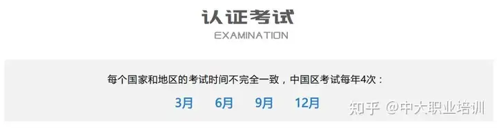 每个国家和地区的考试时间不完全一致,中国区考试每年4次:分别在3月、6月、9月和12月。
