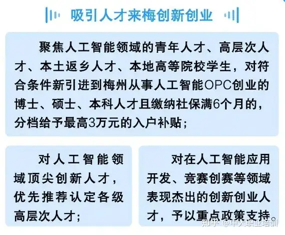 2月14日,梅州市刚刚出台《梅州市实施人工智能OPC创新创业行动方案》,系统整合全市创业扶持、人才安居、产业服务等各类资源,打造“创业有支持、发展有空间、成长有生态”的高质量OPC创新创业集聚区,精准培育人工智能OPC创新创业生态,为梅州深化苏区融湾先行区建设注入数字经济新动能。