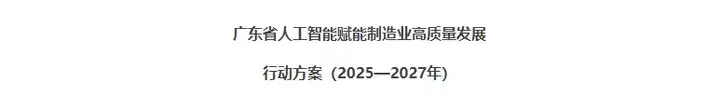 2025年10月21日,《广东省人工智能赋能制造业高质量发展行动方案(2025—2027年)》发布。该方案强调,广东省正全力推动人工智能(AI)赋能制造业,推动制造业数字化改造、智能化跃升,加快打造具有全球影响力的“人工智能+制造业”融合发展示范区。