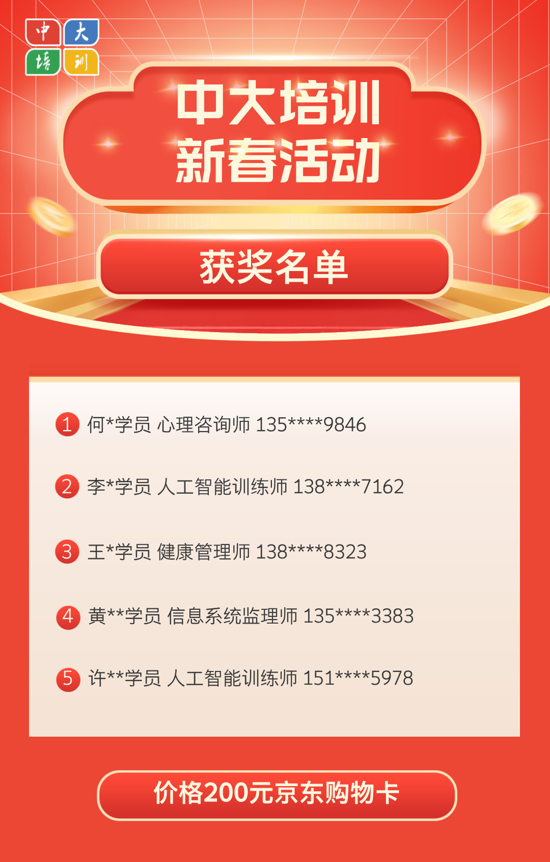内部讯(通讯员 林凡晨)正值元宵佳节,3月3日,广东中大职业培训学院(简称“中大培训”)2026年春节新春抽奖活动结果正式揭晓。本次新春抽奖活动已圆满落幕,活动旨在回馈广大师生与学员长期以来的支持与信赖,共抽取5名幸运获奖者,每位获奖者将获得200元京东E卡奖励。