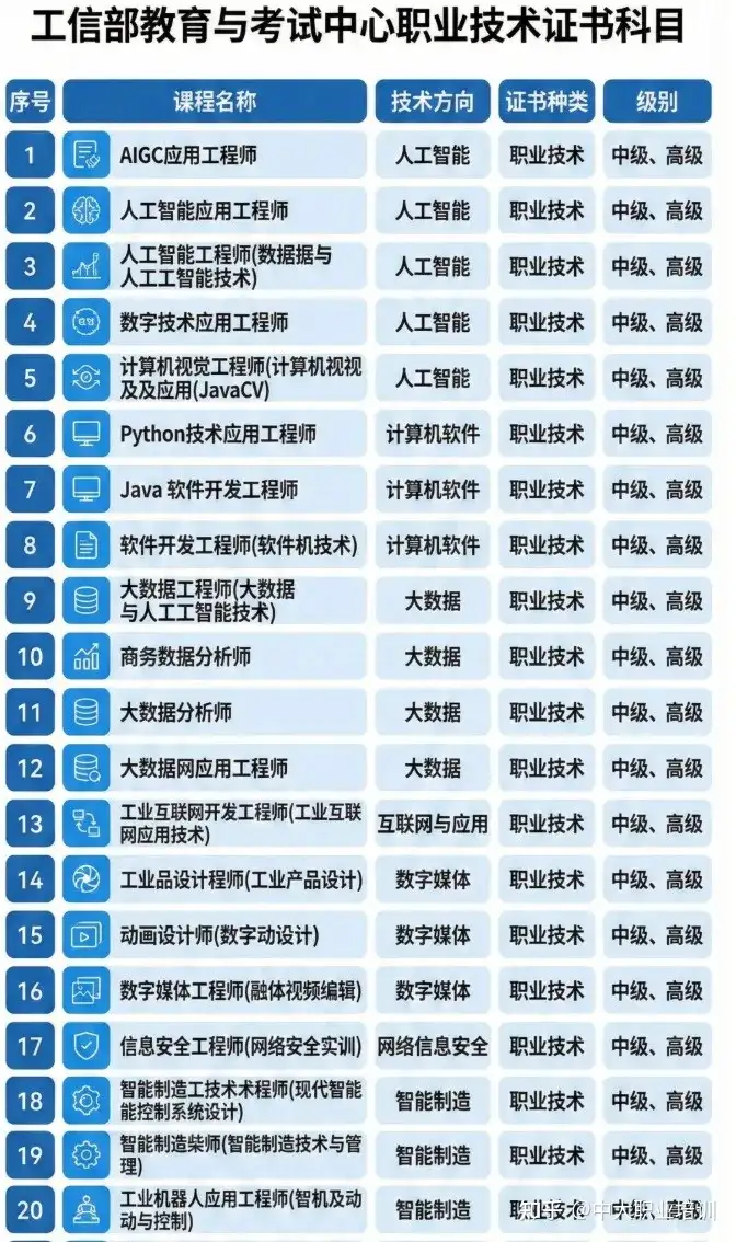 面对2025年国内AI人才缺口预计高达1000万的严峻形势,工业和信息化部教育与考试中心在2026年3月推出了五大黄金认证体系。这包括人工智能应用工程师、人工智能算法工程师、AIGC应用工程师、人工智能训练师以及AI智能体应用工程师。