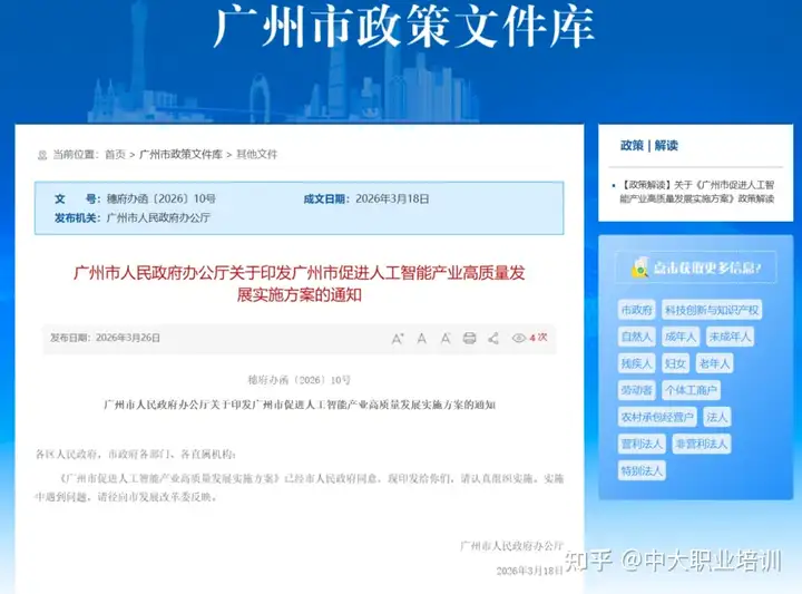 3月26日下午,广州市人民政府门户网站发布《广州市人民政府办公厅关于印发广州市促进人工智能产业高质量发展实施方案的通知》