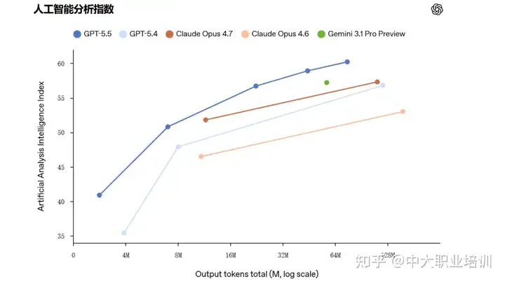 OpenAI公布的数据显示,在Artificial Analysis Intelligence Index(第三方,10项eval加权平均)上,GPT-5.5在同等输出token量下智能得分最高,token总消耗明显低于其他模型。